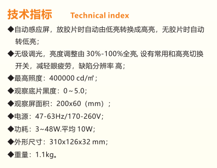ZCX-VIEWER 626超高亮LED观片灯(自动感应屏) ZCX-VIEWER 626观片灯,采用先进的电子感应技术和最新的超高亮度大功率LED光源,亮度高、光线均匀稳定,结构合理、使用可靠,造型美观、携带方便,亮度任意调节、不发烫,不造成底片卷曲,适合长期使用。自动感应屏,放胶片时自动由低亮转换成高亮,无胶片时自动转低亮,有效保护评片人员眼睛,减少劳动强度。也可接脚踏式开关,方便操作,观片角度可调节,更好观察。机壳为铝合金阳极化处理,经久耐用,抗震能力强,是目前理想的X射线成像底片观察灯具。广泛适用于机械、化工、航空、造船、锅炉、电力等单位射线成像底片的评定工作。 |